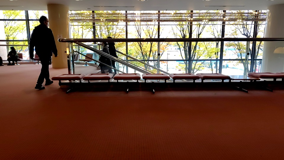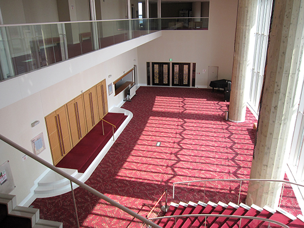 大ホールのエントランスを入ると、建物2階にあるホワイエに出ます。階下席の後列はこのホワイエに通じています。通路前方の座席やトイレは建物の1階にあります。