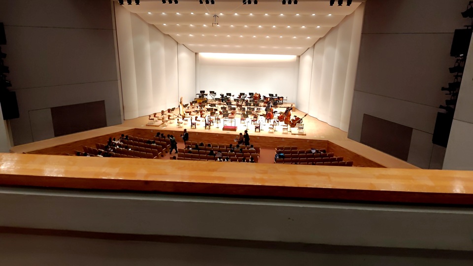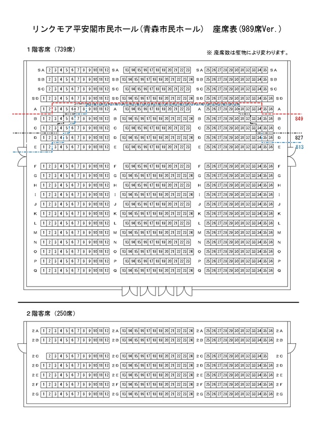 今回の会場より一回り小さく、総客席数は最大で989席(1階:739席、2階バルコニー席:250席)で、舞台の奥行拡張や花道の設置等により1階席が増減します。