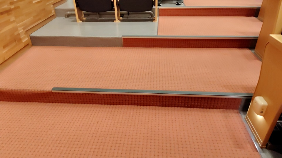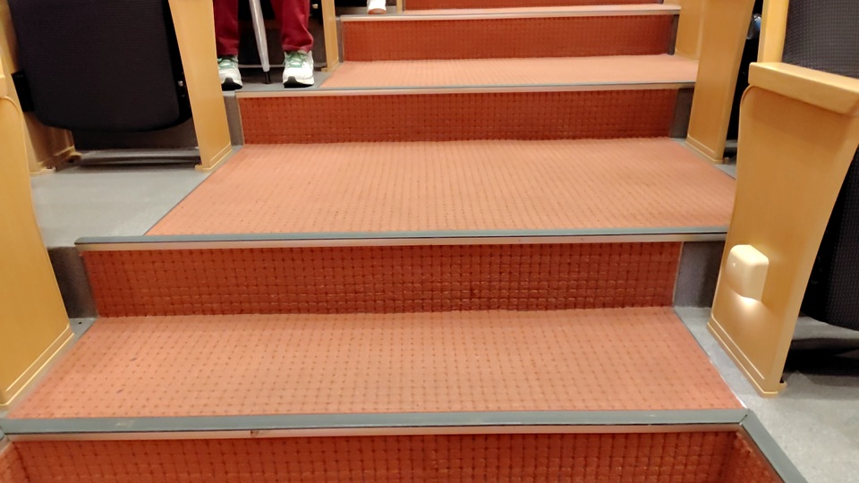 通路後方は、先頭のた列(16列目)以降から前方より高低差のある段差が付き、傾斜が強めになっています。先頭のた列も通路より一段上がった位置にあり、見晴らしが良くなっています。