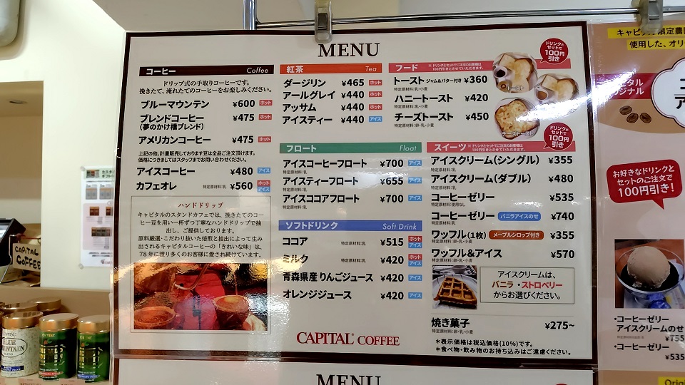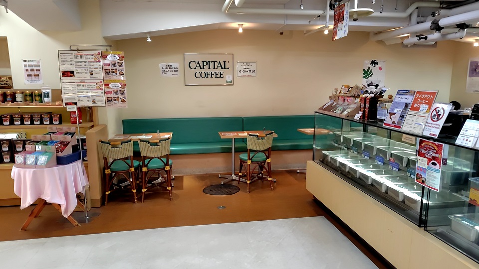 地下1階の食料品フロアにあるキャピタルコーヒーは、イートインのできるコーヒー豆の販売店です。テーブルは3,4台ほどしかありませんが、少し休憩するのにちょうどいいスポットです。