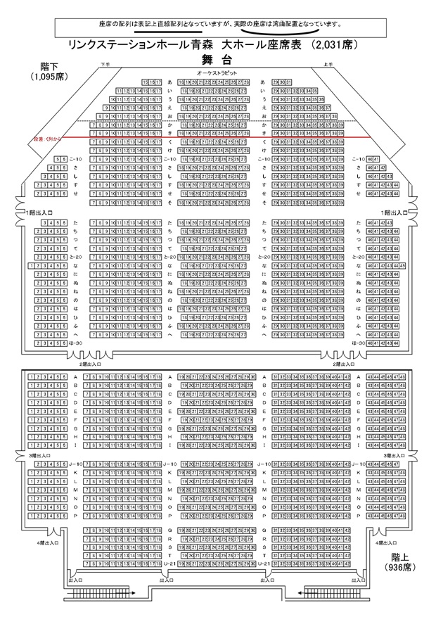 階上席(2階席)の総客席数は936席で、A列からU列までの21列あります。途中、建物の3階・4階からの出入口に対応する形で、I列(9列目)とJ列(10列目)の間と、P列(16列目)とQ列(17列目)の間に通路が設置されています。