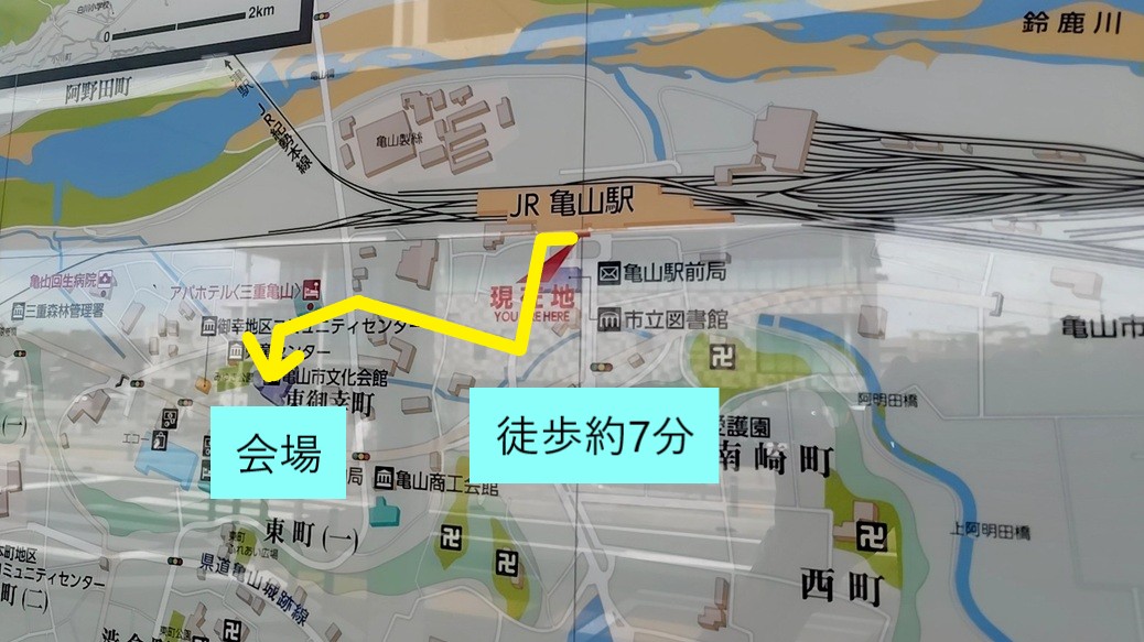 JR亀山駅に着いてから、会場までの徒歩ルートを紹介します。駅から会場までの所要時間は徒歩約7分です。