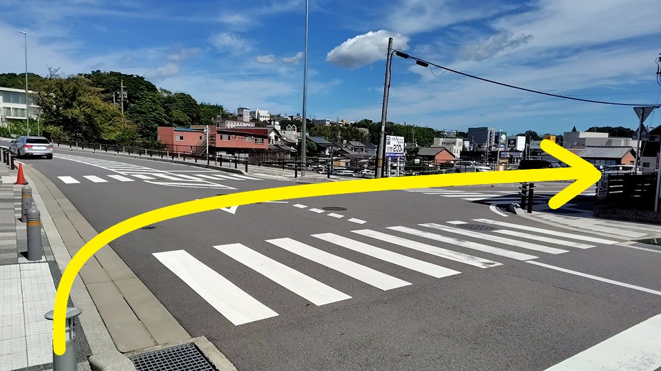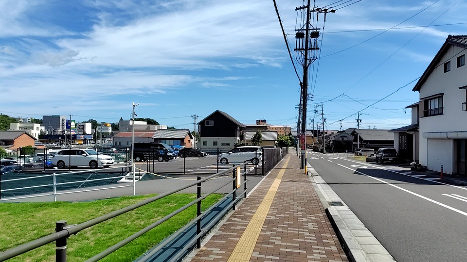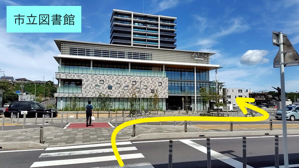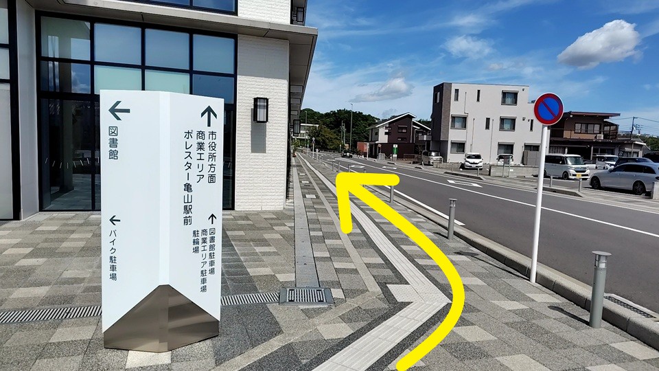 すぐ前の建物は亀山市立図書館です。その右側面に回る感じで移動しましょう。