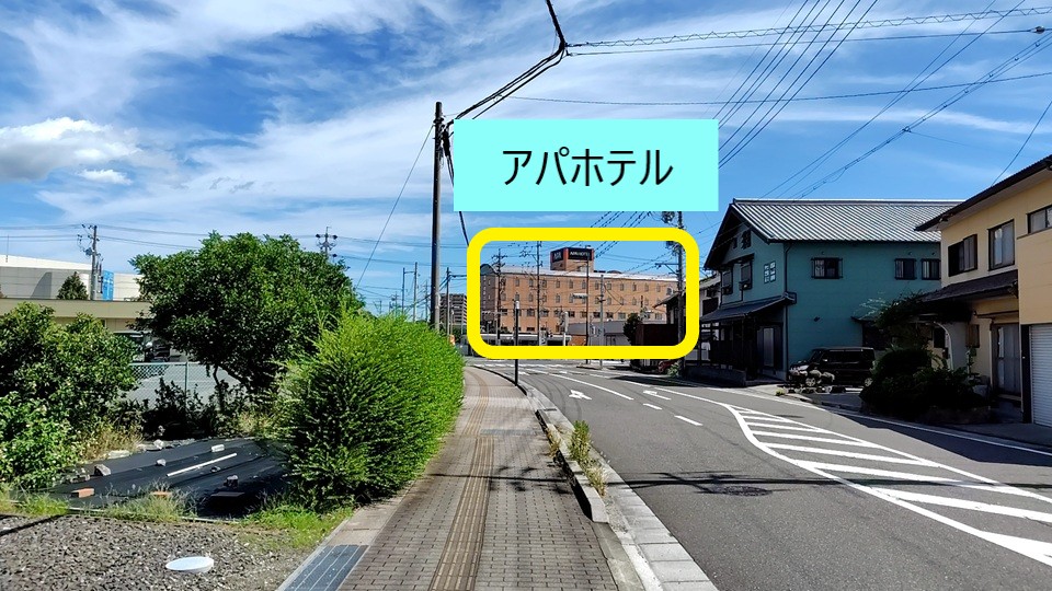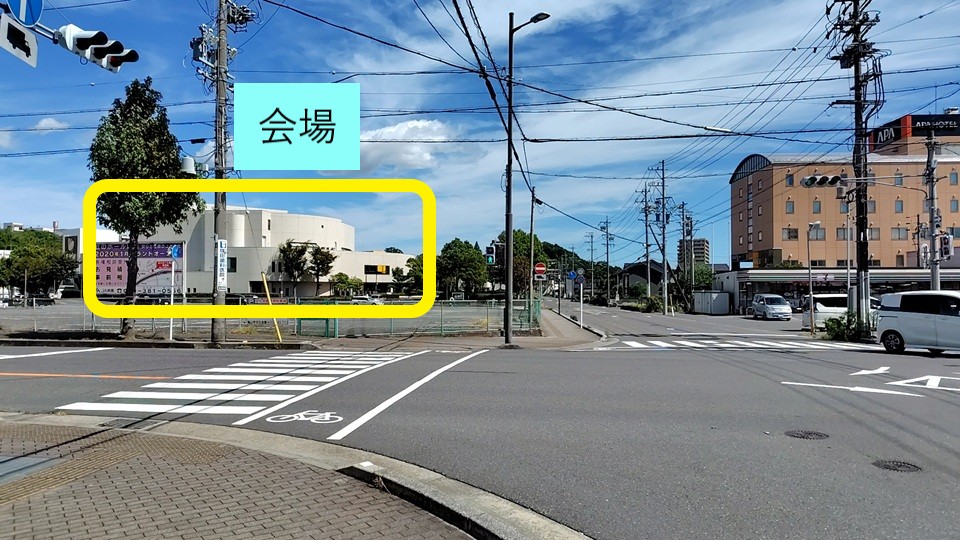 交差点に差し掛かると、アパホテルの向かいに会場の白い建物が見えてきます。