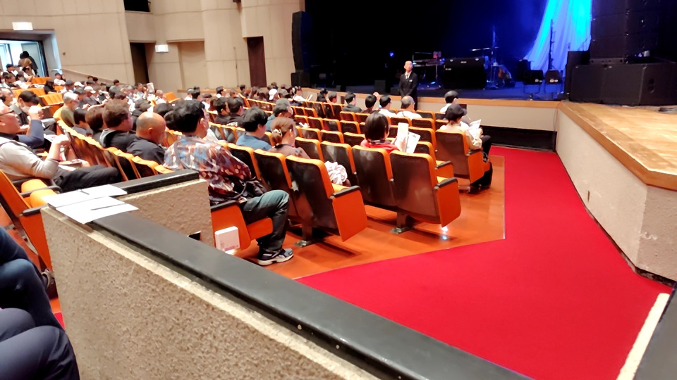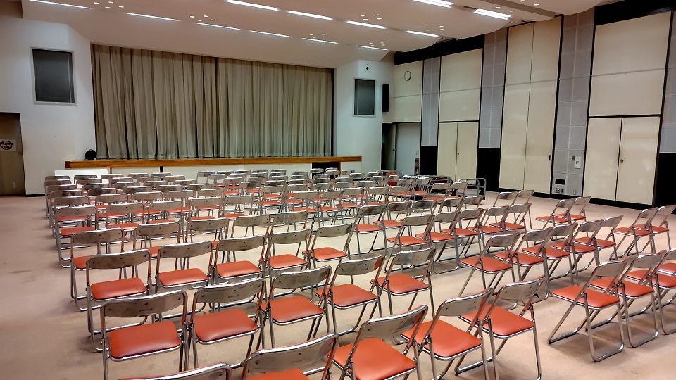 中央コミュニティセンターは、幅13.5m×22mの広さのスペースに、最大で約400名を収容することができる平土間の空間です。客席を設置する場合は、ご覧のようにパイプ椅子が並べられます。