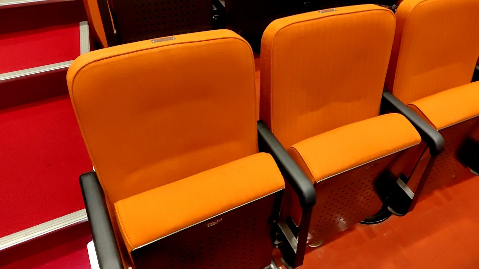 座席はオレンジ色の座面・背もたれにひじ掛けが付いたタイプです。座面のクッションはやや厚めになっており、座り心地は上々でした。
