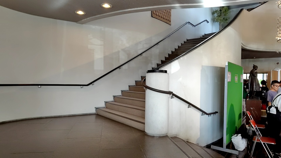 後方の客席は建物2階にあるので、ロビー奥の階段で移動します。