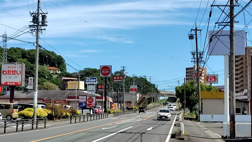 会場との間を走る県道28号沿いには、ファミレスや飲食店が軒を連ねています。