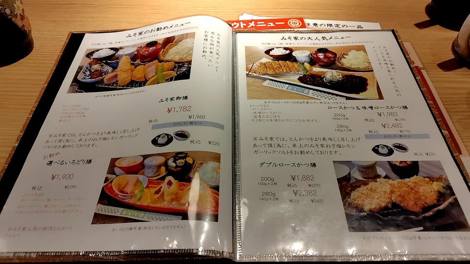 メニュー表。ランチはキャベツ・味噌汁がお替り自由で、2,000円以下で楽しめます。