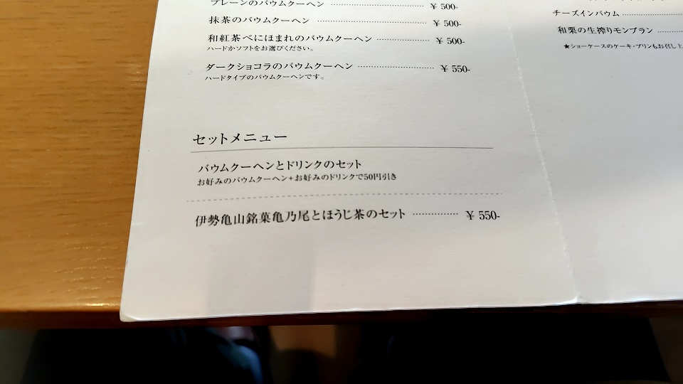 カフェでは、バウムクーヘンや亀乃尾とのセットメニューを注文できます。