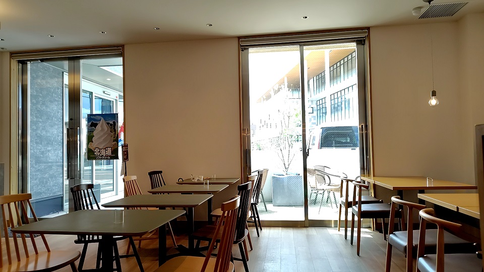 リニューアルされた店内にはカフェコーナーが設置されており、銘菓とのドリンクセットを楽しめます。バウムクーヘンはしっとりハードタイプとふわふわのソフトタイプの2種類から選ぶことができます。