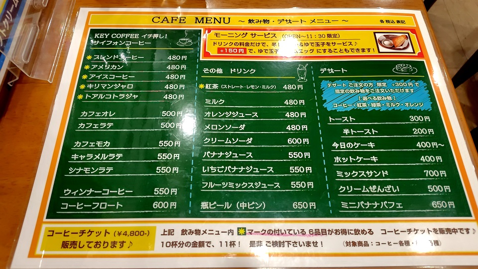ドリンクメニューです。サイフォンで入れたコーヒーや各種ドリンク、デザートセットもあります。
