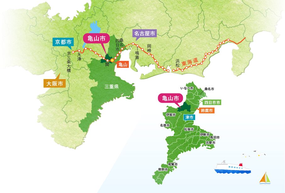亀山市は三重県の北中部にあり、主要都市の四日市市や県庁のある津市、鈴鹿サーキットで有名な鈴鹿市の近くにあります。東名阪自動車道や国道1号線(名阪国道)の亀山インターや、周辺のゴルフ場も多いので、その関係でご存じの人もいるかもしれません。