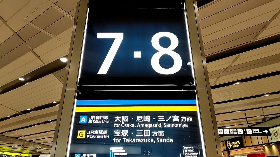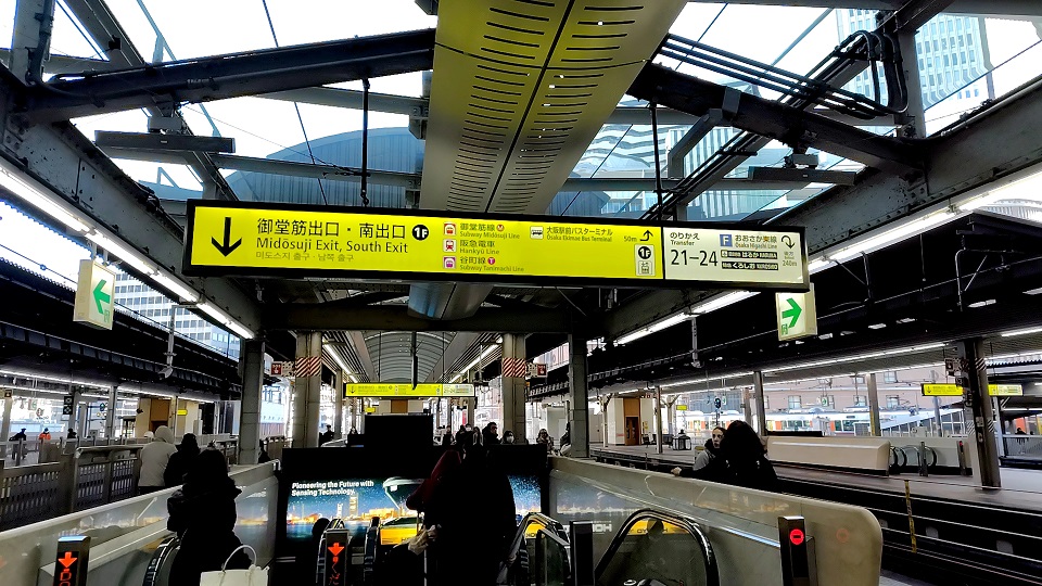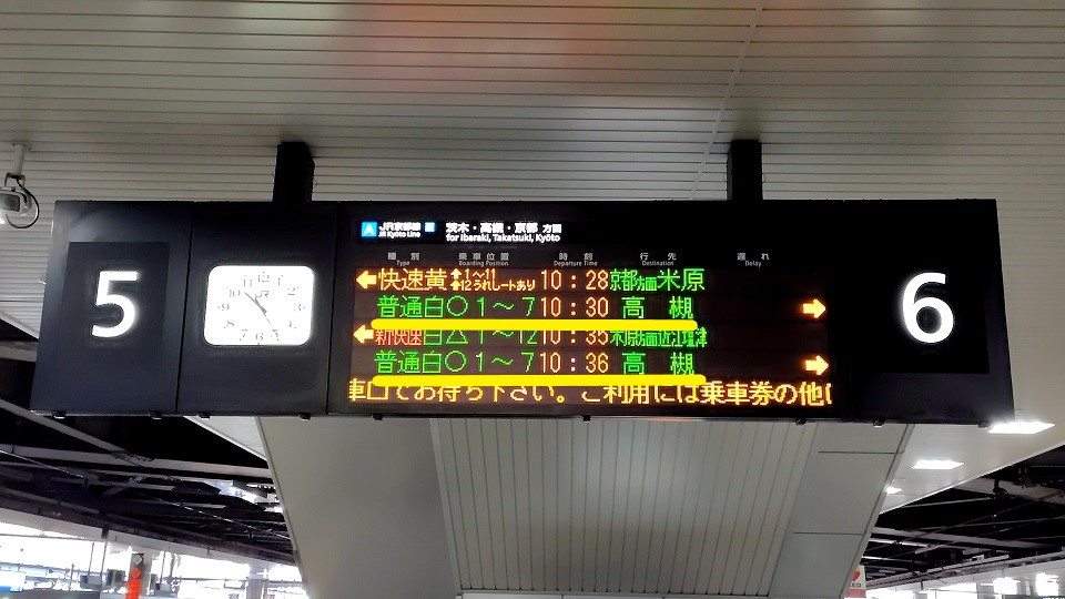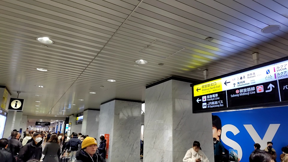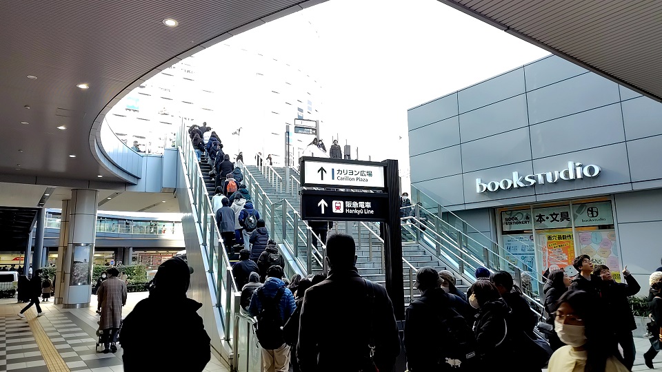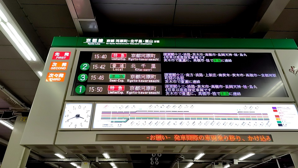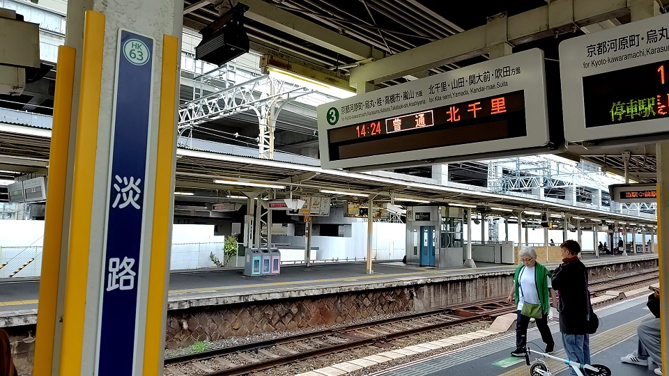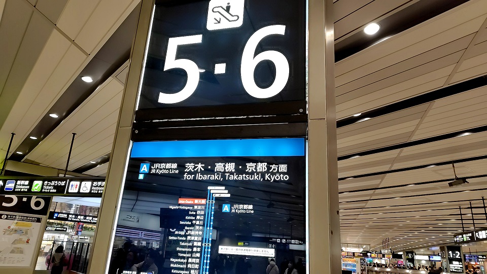 会場のある吹田駅に向かうには、大阪梅田駅の1番~3番のりばから発車する京都線・千里線の電車に乗車します。