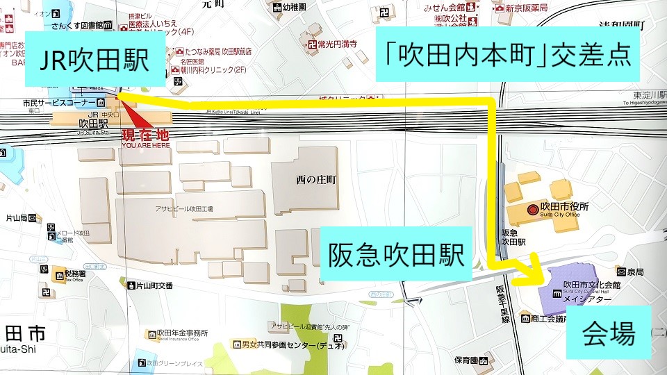 JR吹田駅から会場までの所要時間は徒歩約15分。それなりに時間はかかりますが、まっすぐ進んで右に曲がればOKのシンプルなルートです。