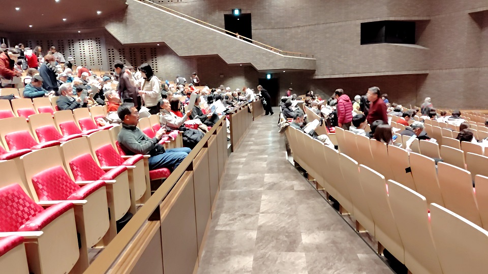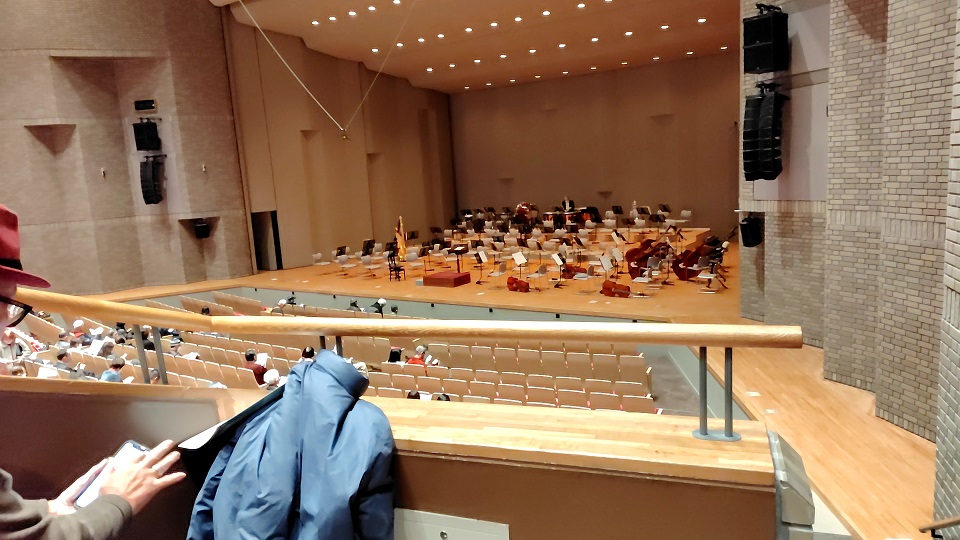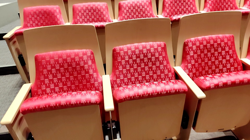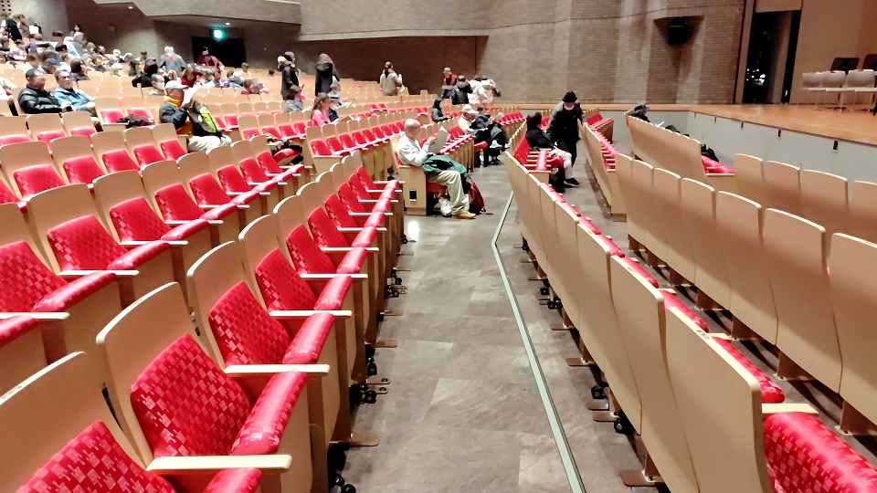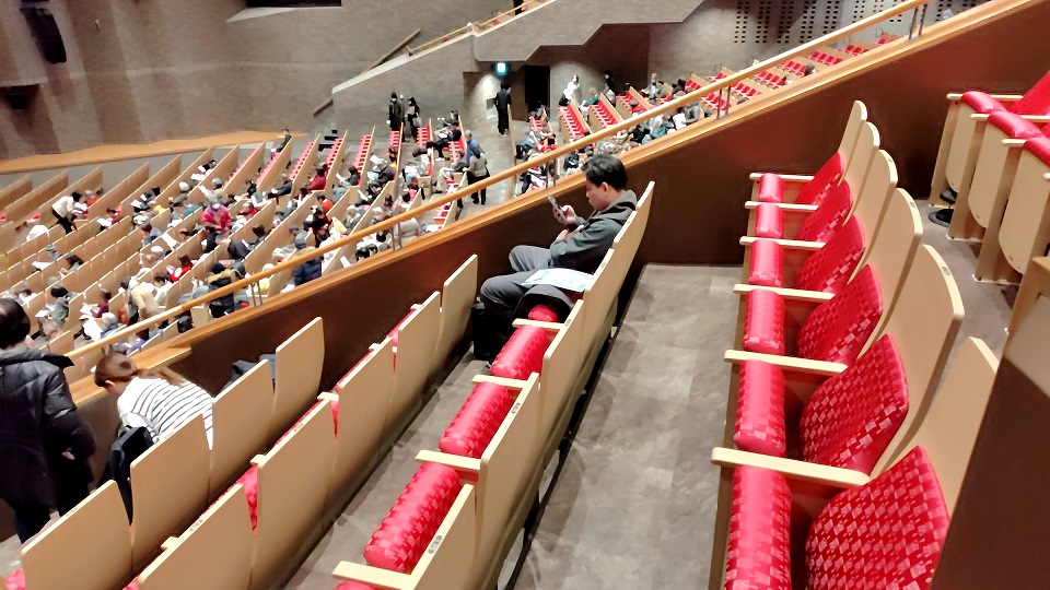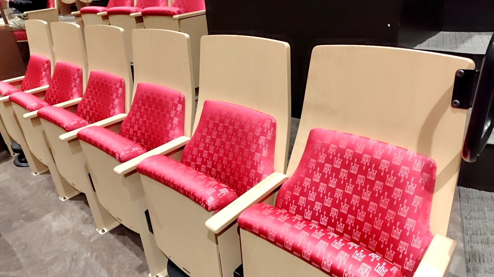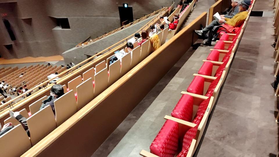 大ホールの座席は、王冠?のような刺繡の模様が入った赤い座面・背もたれと木製のひじ掛け・基礎の組合せです。適度なクッションの厚みと硬さで、座り心地は上々でした。