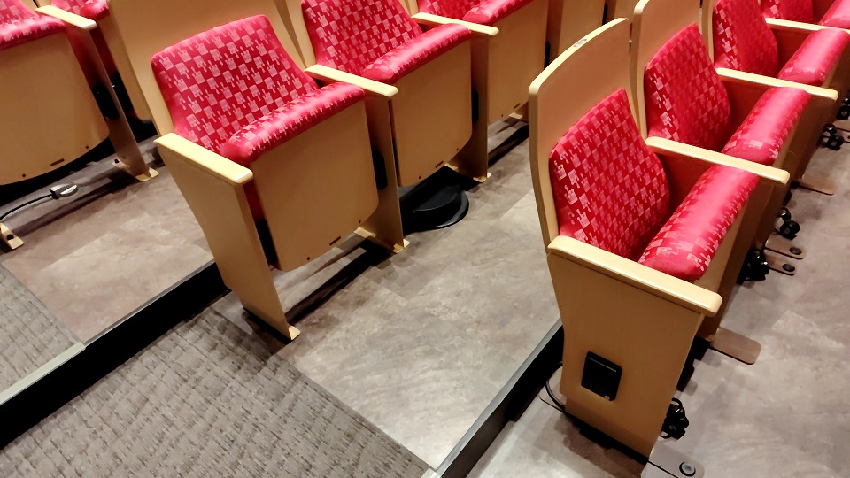 座席の傾斜は、通路前方の8列まではフラット、9列以降は段差で傾斜が付けられています。また、車いすスペースは最後列(17列)の中央に5席分確保されています。