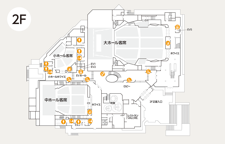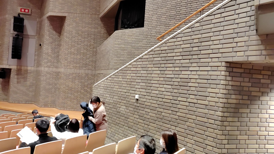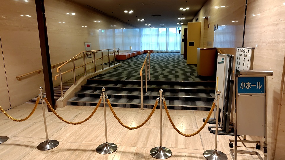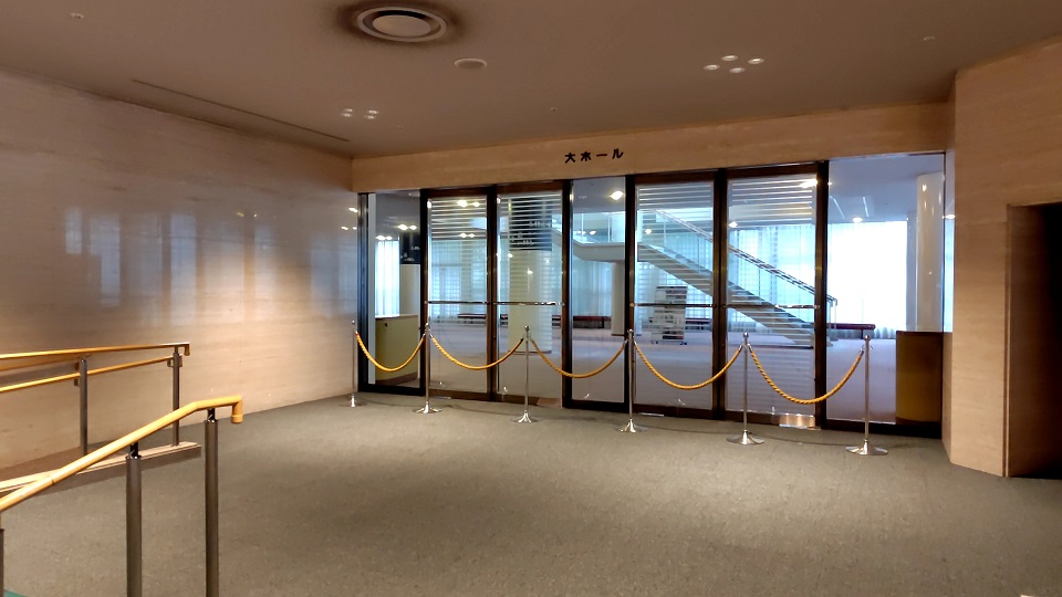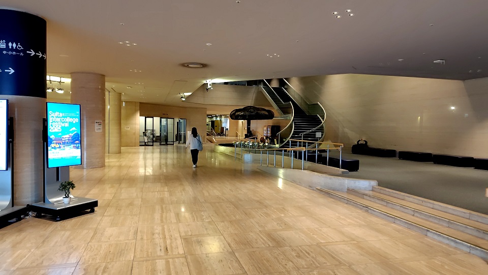 会場の建物は4階建てで、正面のエントランスは建物の2階に位置しています。中に入ると、ロビーがあり、それぞれ大ホール・中ホール・小ホールのエントランスに続いています。