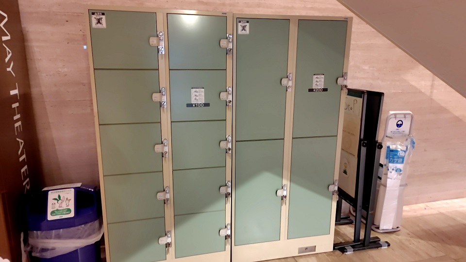 事務室横には自販機コーナーとコインロッカーが設置されています。コインロッカーは数は少ないですが小型と中型の2種類あり、使用料は小型が1回100円、中型が1回200円です。