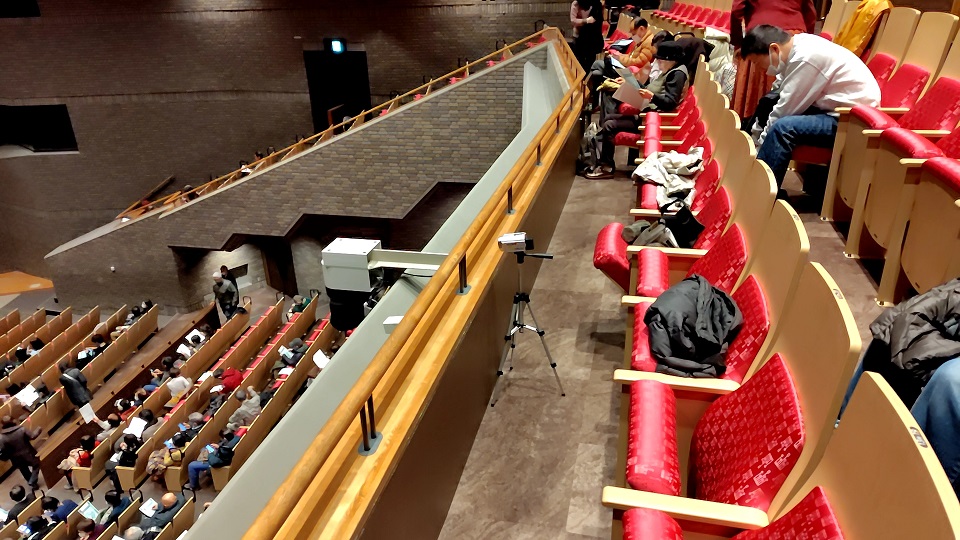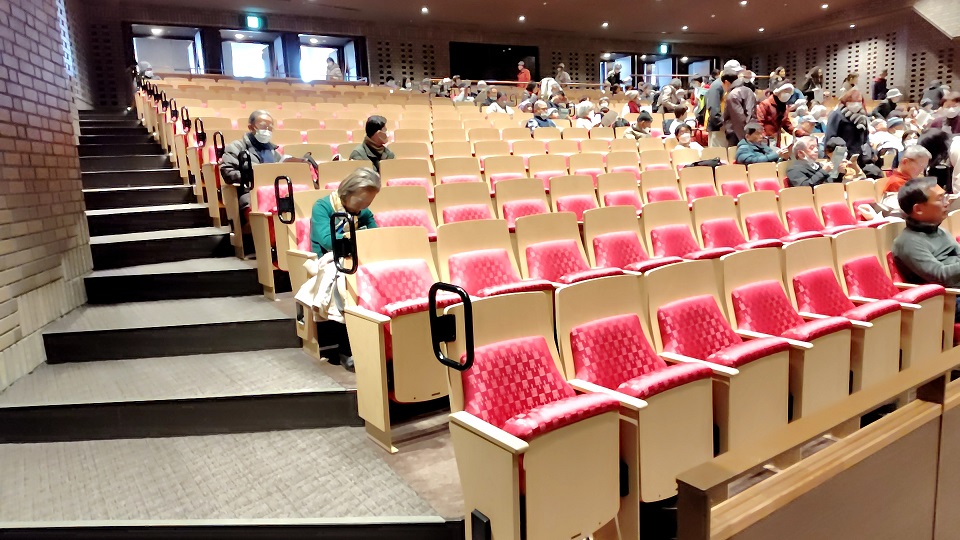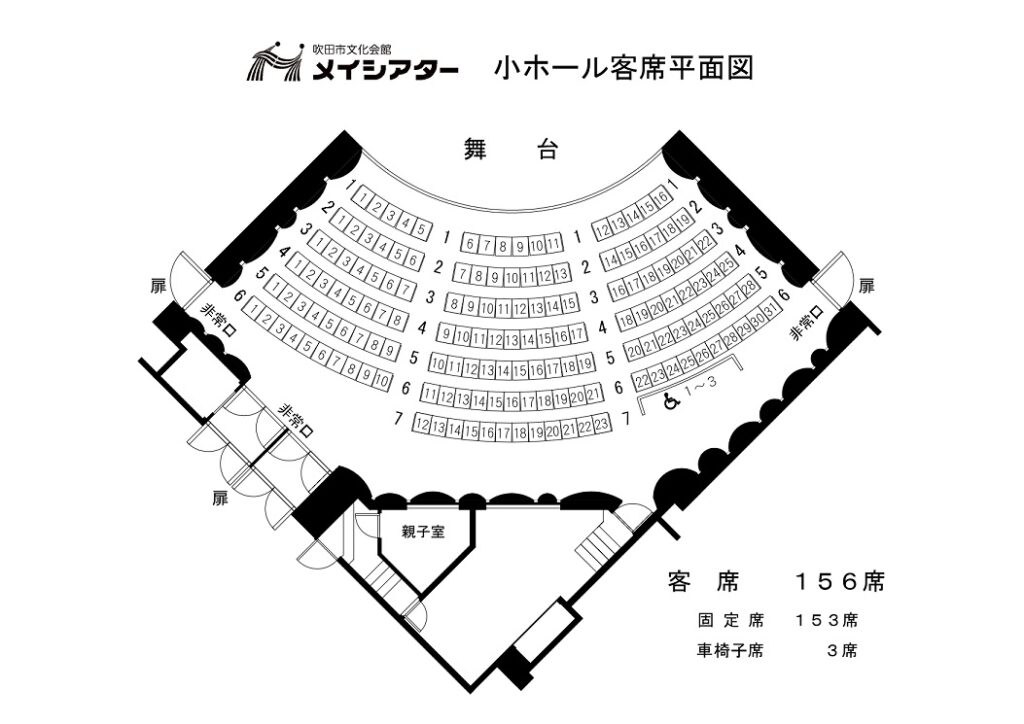 小ホールの総客席数は156席で、扇形に1列から7列まで配置されています。人形劇や発表会の催し等にちょうどいいキャパで、写真を見る限りでは、座席間は独立しておらず、列ごとにベンチのようにつながっている感じです。