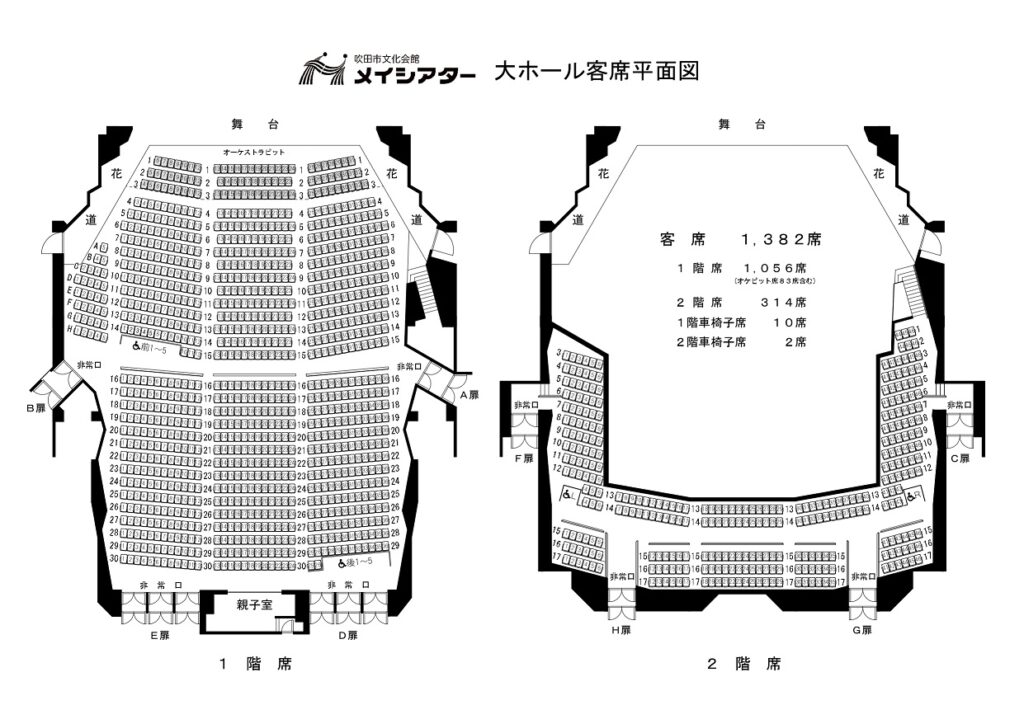 大ホールの総客席数は1,382席で、1階席と2階席の二層構造です。多目的ホールで、コンサートのほか、オペラやバレエにも対応可能な設備を有しています。