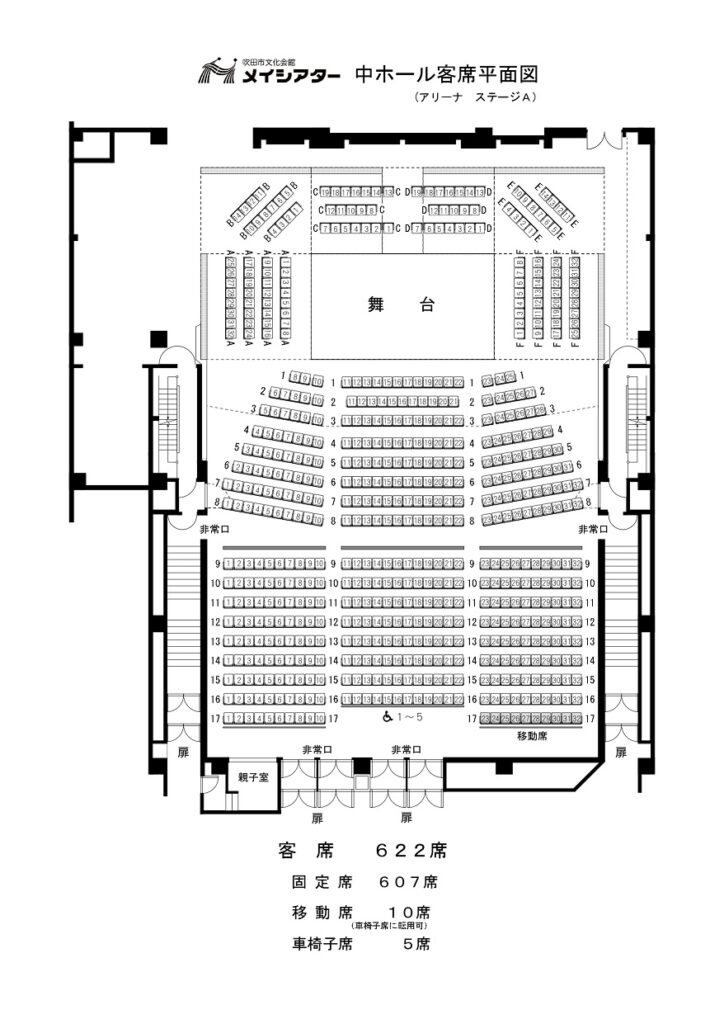 中ホールの総客席数は492席で、1列から17列まであります。演劇やミュージカル等に適したキャパのホールで、途中、8列と9列の間に中央通路が設置されています。