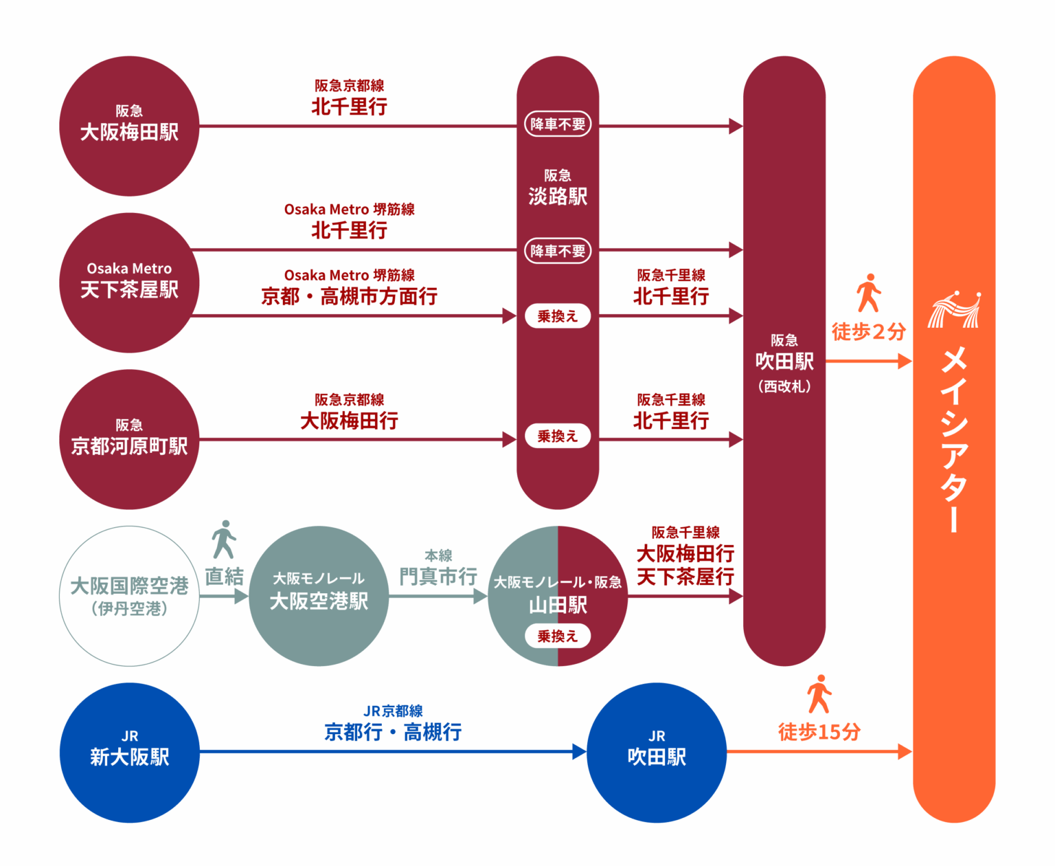 メイシアターの最寄り駅は、阪急千里線「吹田」駅。西改札からすぐの駅前にありますが、JR京都線「吹田」駅からも徒歩約15分で、十分徒歩圏内にあります。