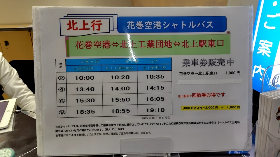 そこで、到着便に合わせて出ているシャトルバスで北上駅まで移動し、北上駅からレンタカーを利用すれば、移動距離は約半分になり、下道の移動(約30分)で済みます。今回私はこの方法でアクセスしたので紹介します。