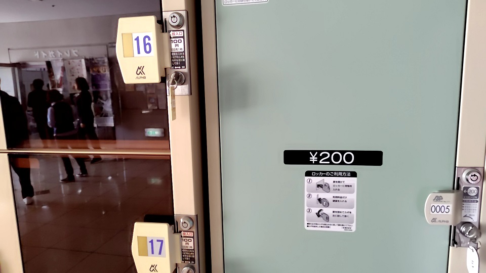 ロッカーは小型と中型があり、小型が100円、中型が200円で利用できます。