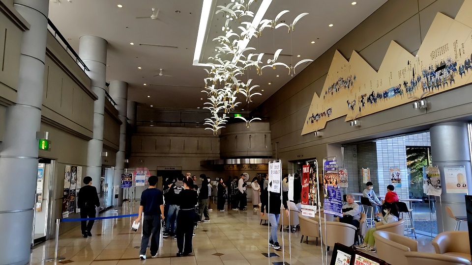 正面玄関を入った所にエントランスロビーがあり、大ホール・中ホールのホワイエのほか、展示室や事務室にも続いています。ご覧の通りそれほど広くはない横長の空間で、開演前には入場待ちの人で混雑します。