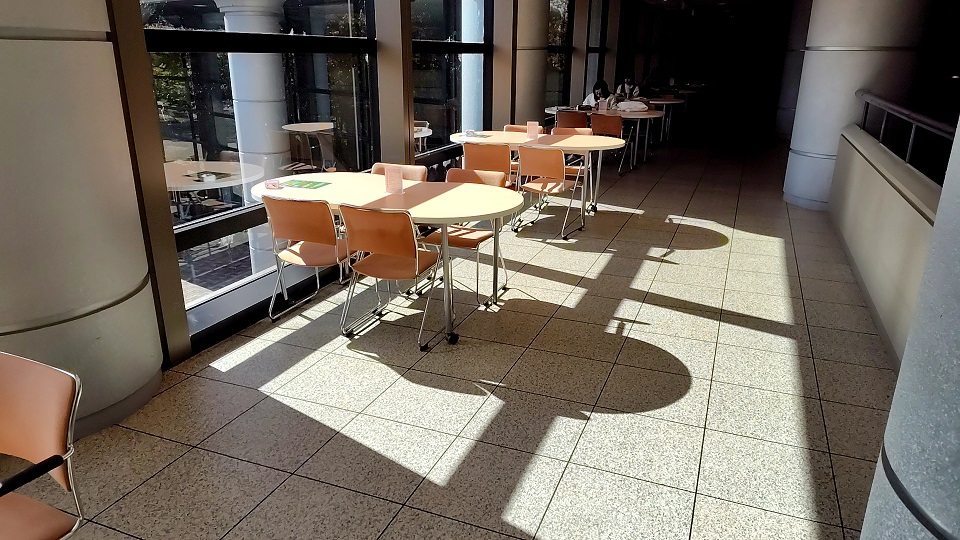 その横の中庭に面した場所にイスとテーブルが設置されています。
