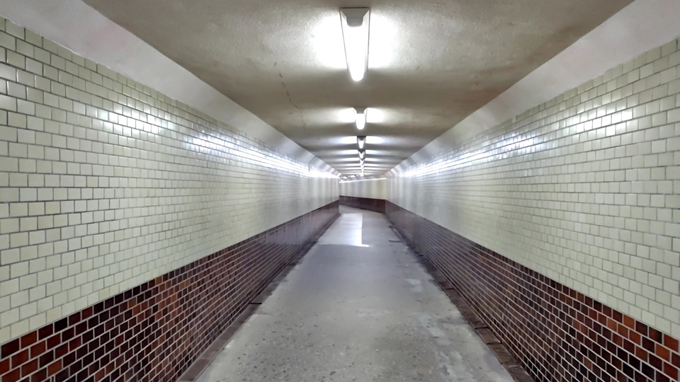 突き当りに東口に向かう地下道があるので階段を下ります。