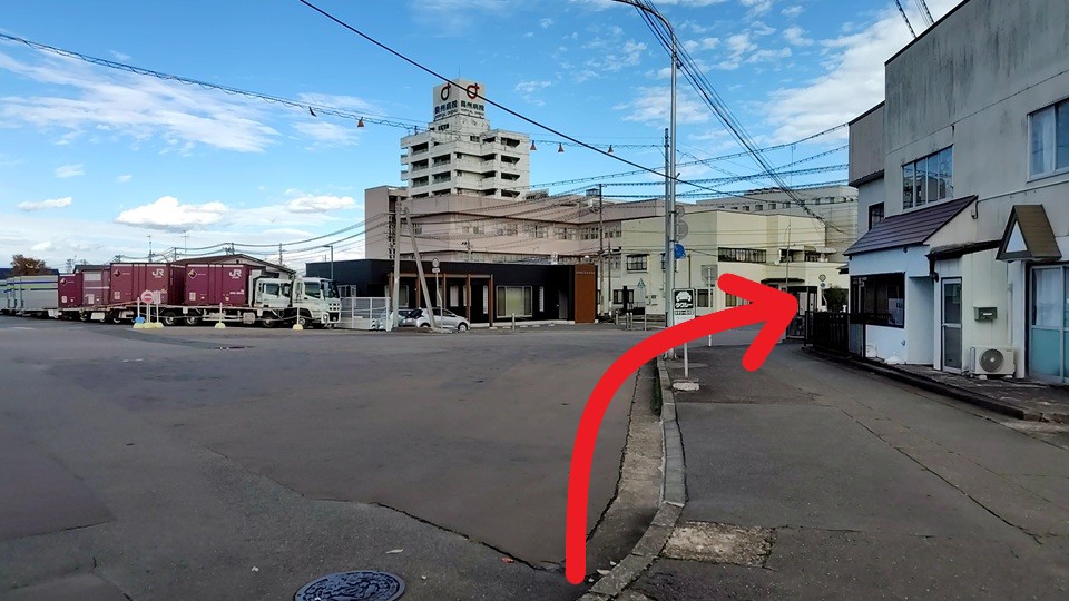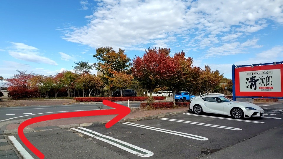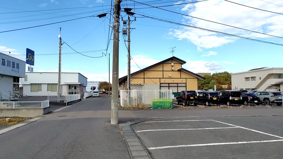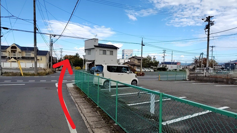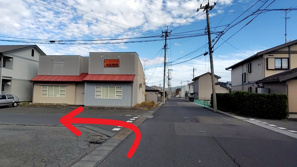 角にある回転寿司店の駐車場の先を、右に曲がります。