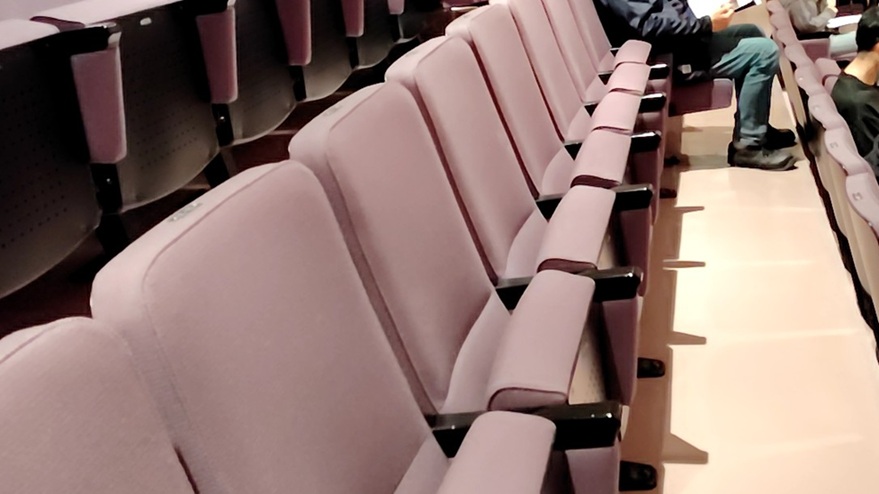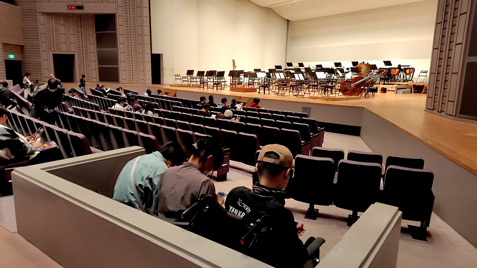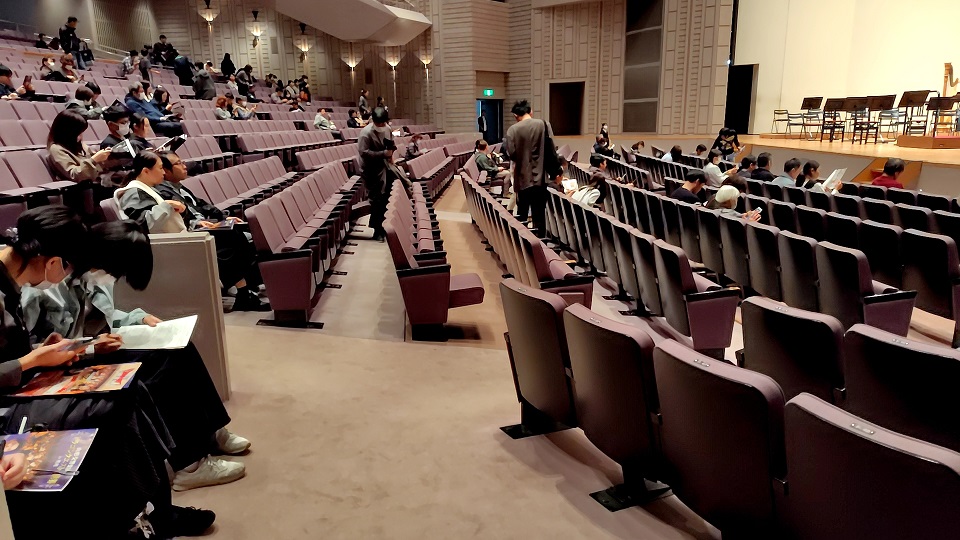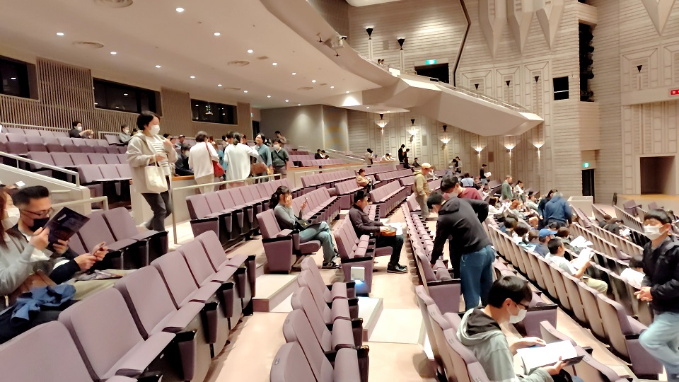 座席間の傾斜は、中央通路より前方は、オーケストラピットとなるA列からD列まではほぼフラット、入口扉A付近のI列までは緩やか傾斜、以降のJ列以降から中央通路後方にかけて段差が付き、前方よりも傾斜は強めになっています。