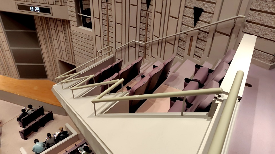 座席間の傾斜は、通路前方のG列まではスロープによる緩やかな傾斜、通路後方のH列以降は段差の付いた少し強めの傾斜となっています。
