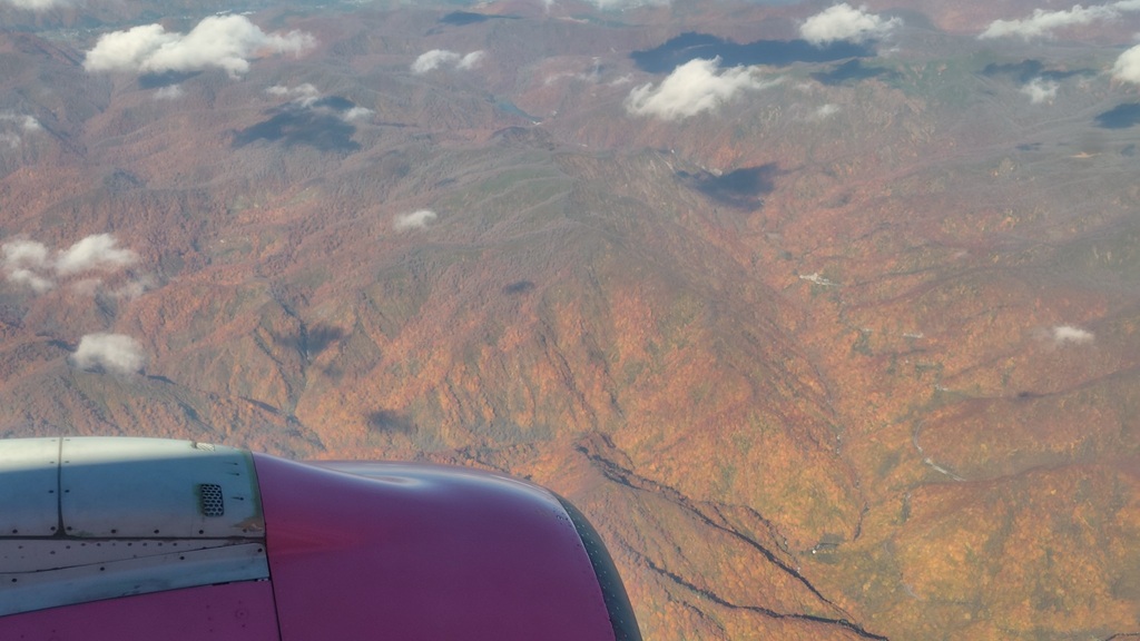 道中は天気も良く、秋の紅葉がきれいに見えました。飛行時間約70分(帰りは約85分)です。
