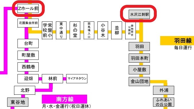 上記路線のうち、会場最寄りのバス停である「Zホール前」には、黄色の羽田線とピンク色の南方線が停車します。羽田線は毎日運行していますが、南方線は、平日(月・水・金)のみの運行です。