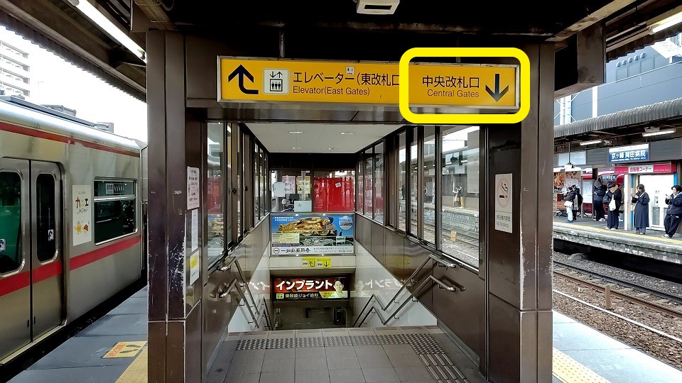 徒歩で向かう場合は、駅のホームから「中央改札口」に向かいましょう。