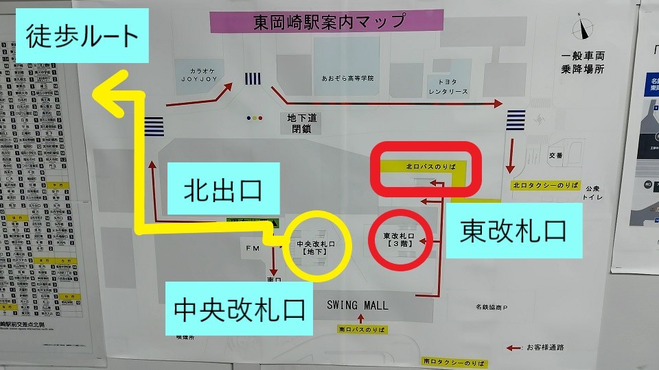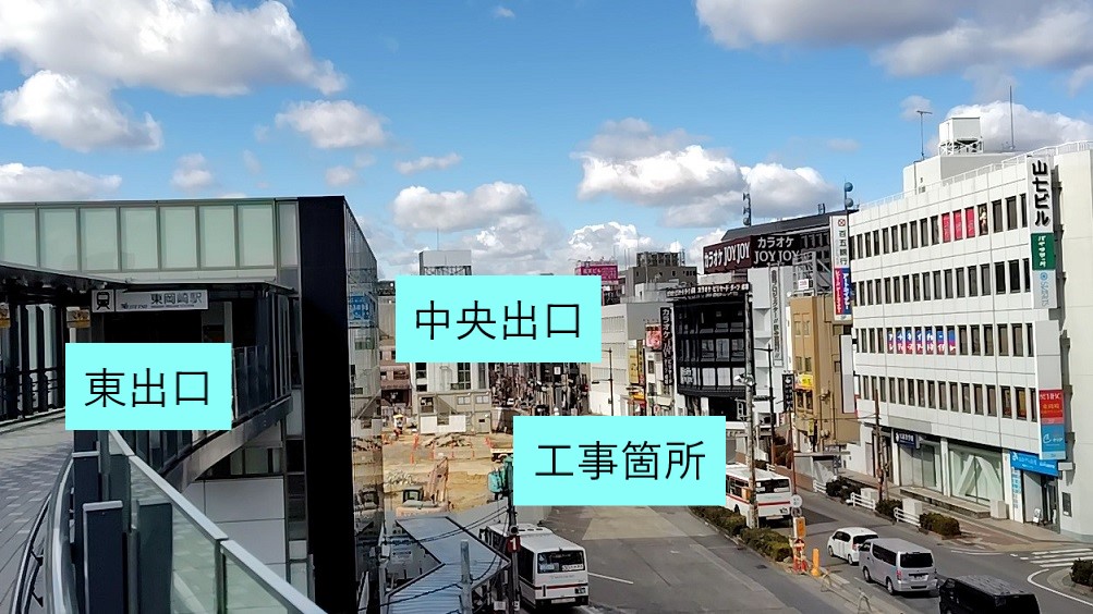 なお、2026(令和8)年2月現在、東岡崎駅は工事中で、東出口と中央出口の往来ができなくなっています。そのため動線の関係で、この後紹介する徒歩で向かう場合とバスを利用する場合では出口が異なることに、少し注意する必要があります。