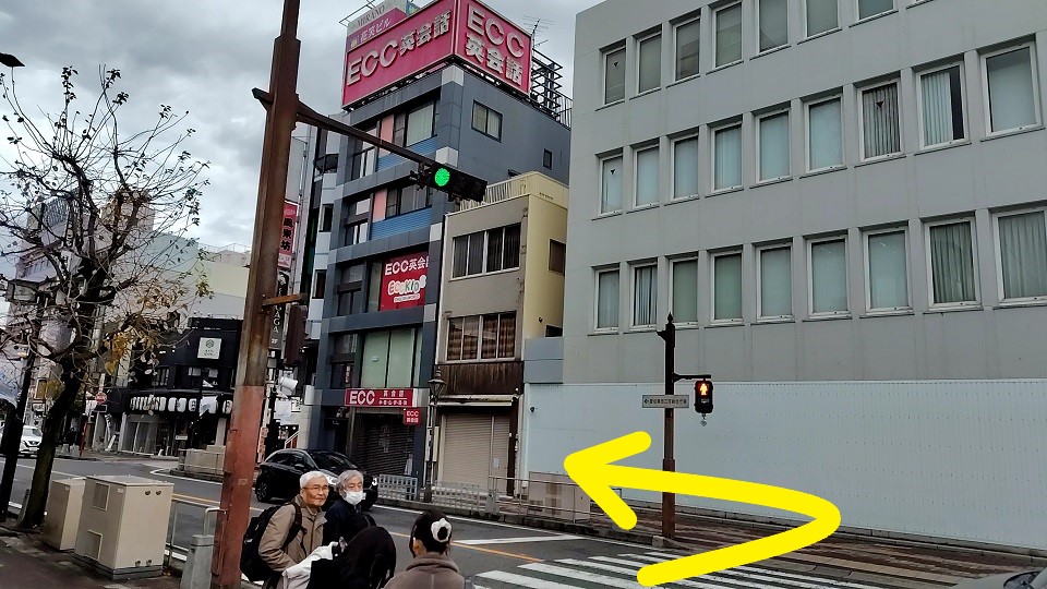 駅前通りに出たら、横断歩道を渡り左に進みましょう。