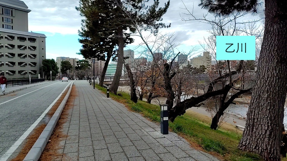 しばらく乙川の河川緑地を右に見ながら移動します。