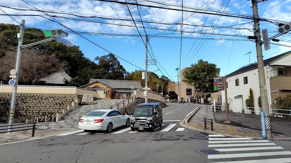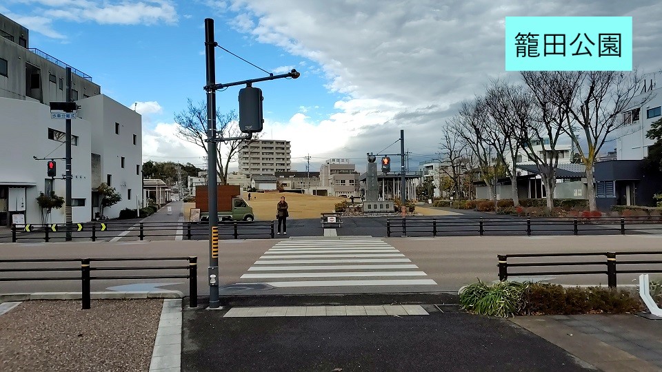 横断歩道を渡れば、籠田公園の入口です。ここから先はバスルートと同じなので省略します。駅から公園までは徒歩約15分です。