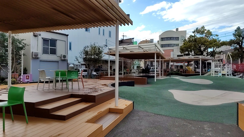 バスや徒歩によるアクセスルートで出てきた籠田(かごだ)公園は、「QURUWA戦略」という、公民連携プロジェクトの一つとして再整備された公園です。