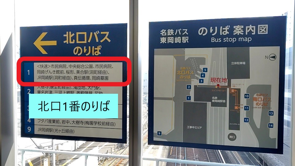 改札前にある案内板を確認。北口の1番のりばから出るバスを利用します。