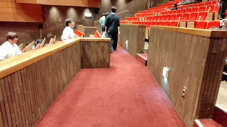 通路後方は、前方よりさらに段差2つ分の傾斜が付けられており、前列の人の頭をほぼ気にせず鑑賞することができるようになっています。それほど奥行きもなく、最後列付近からでもストレスなくステージを鑑賞できる会場だと思います。