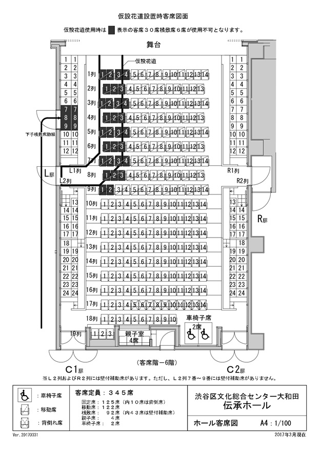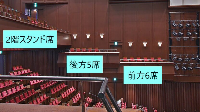 舞台に仮設花道を設置する場合は下手側に設置されるため、固定席の1列から9列と桟敷席の7列から9列までの左側の席が除外されます。