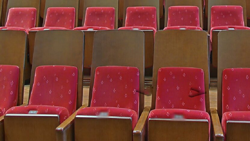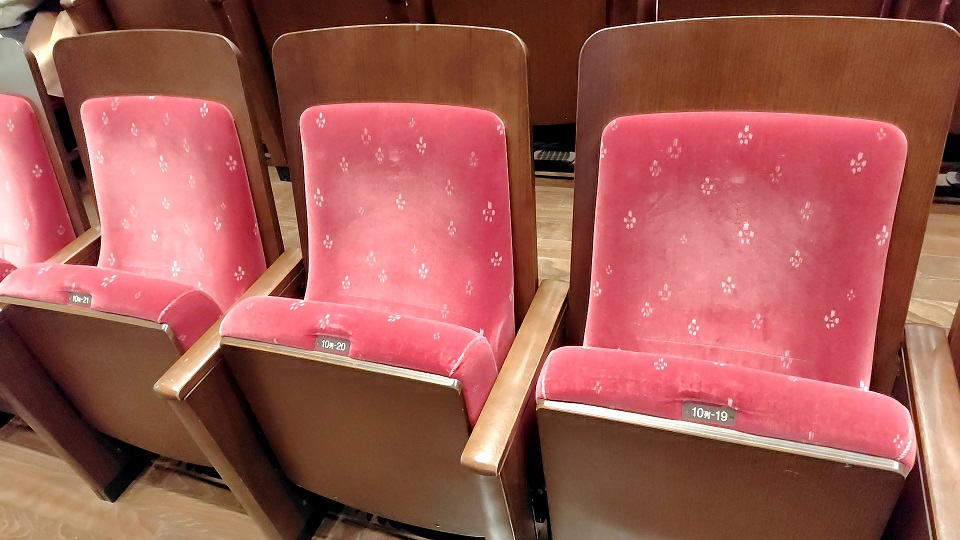 座席はさくらホールという名前ににちなんでか、花びらの模様の入ったピンク色の座面・背もたれと木製のひじ掛け・基礎の組合せです。