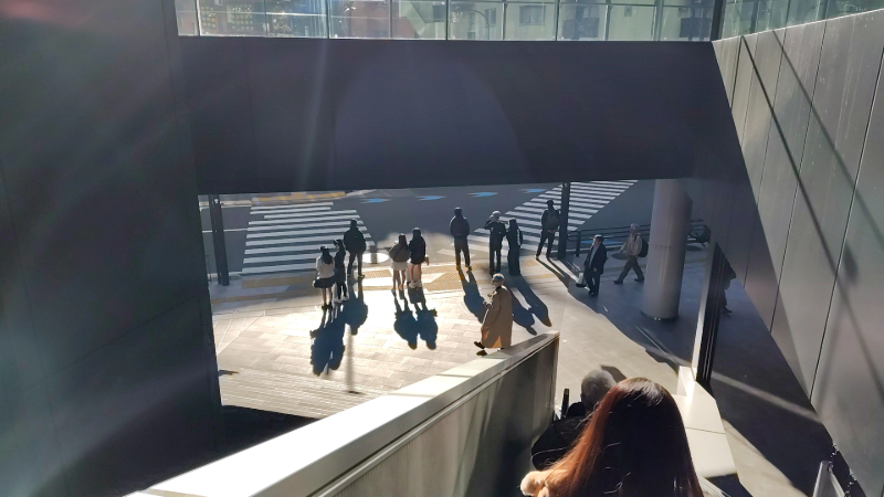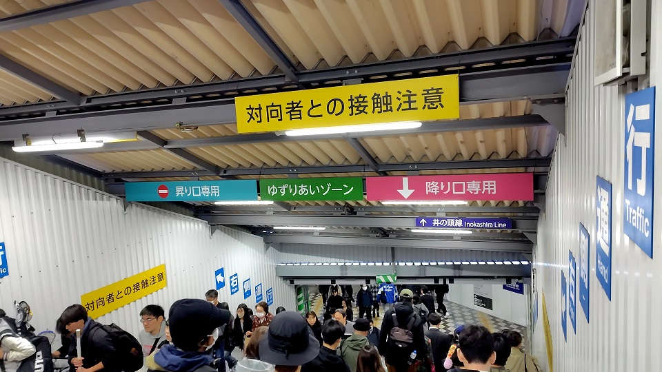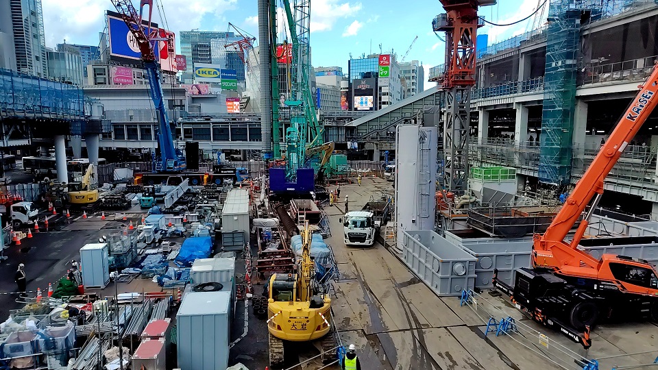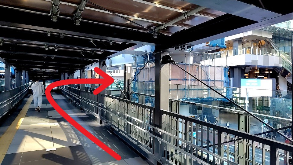銀座線の渋谷駅は地下鉄ですが地上駅(地上3階)で、渋谷サクラステージまで地上に下りず、工事現場を迂回するように構築されている歩道橋を伝って向かう形になります。