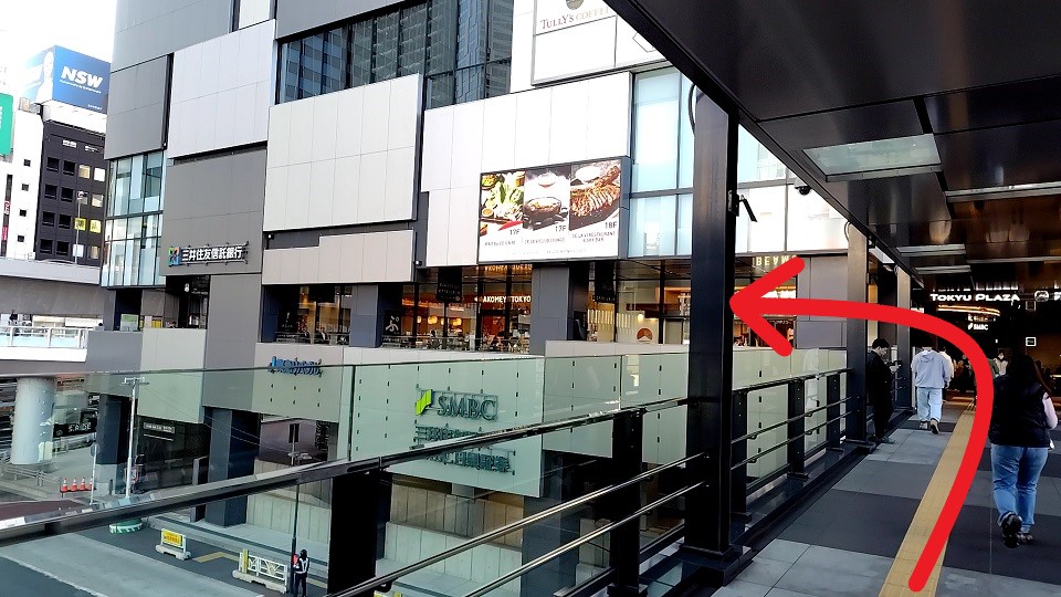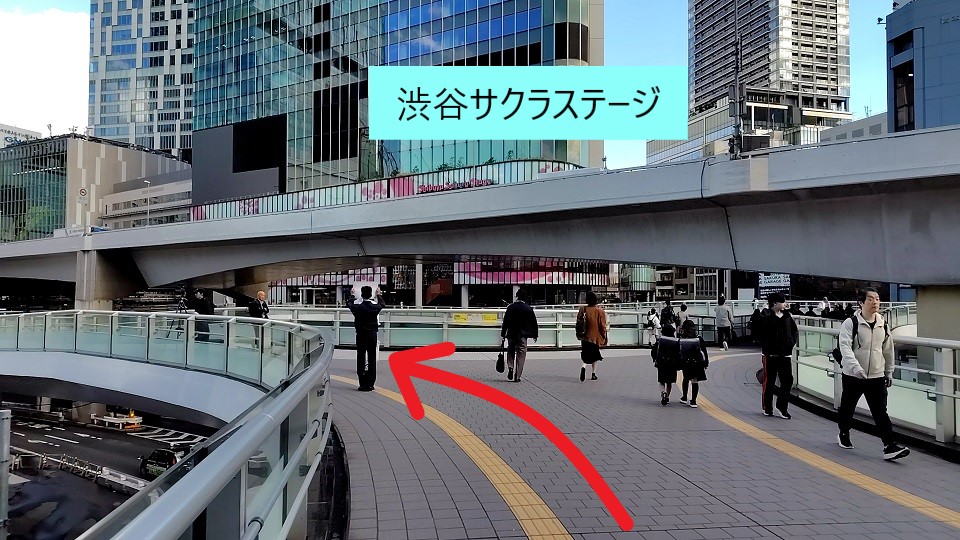 ペデストリアンデッキのような場所に出るので、正面に渋谷サクラステージを見ながら、左に進みましょう。