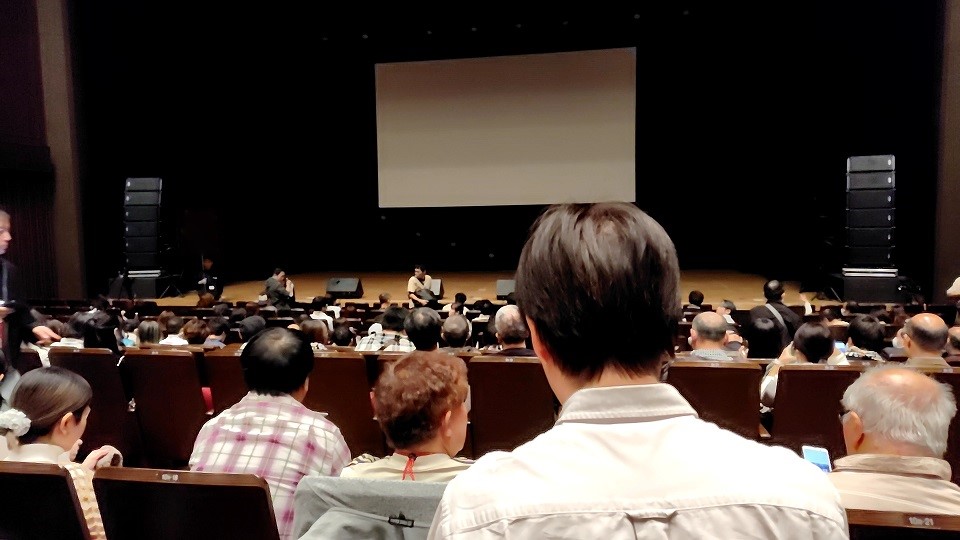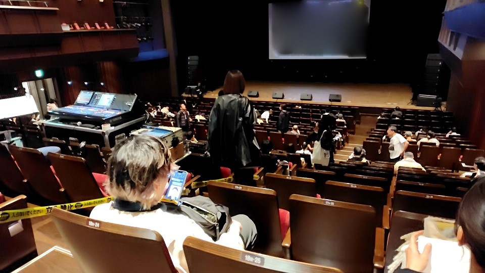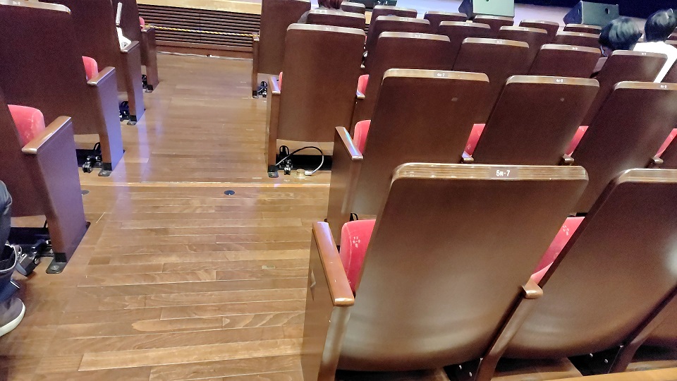 固定席は1列から19列まであります。8列付近に中央通路があり、出入口扉の後方に当たる10列から段差が付けられています。